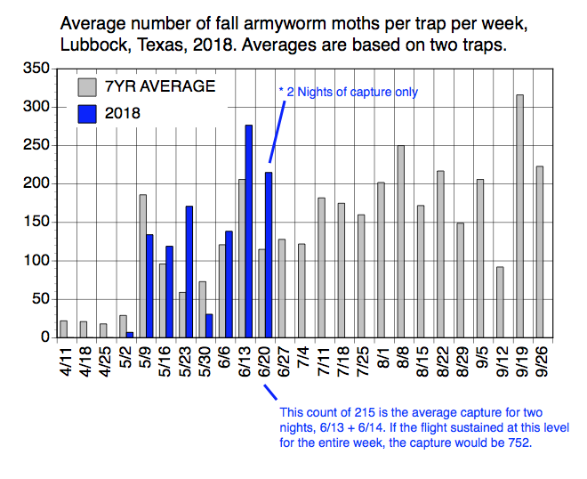 This does not appear to be a phenomenon confined to the Lubbock Research Center, as Katelyn Kesheimer, EA-IPM in Lubbock and Crosby counties, reported several hundred moths in the Crosby County traps she operates. (Rain filled the traps so it was not possible to count all the moths, but there were hundreds.) Additionally, Blayne Reed, EA-IPM in Hale, Swisher and Floyd counties, drove to Plainview from College Station late last week and reported that fall armyworm moths were very abundant at rest stops along the way.